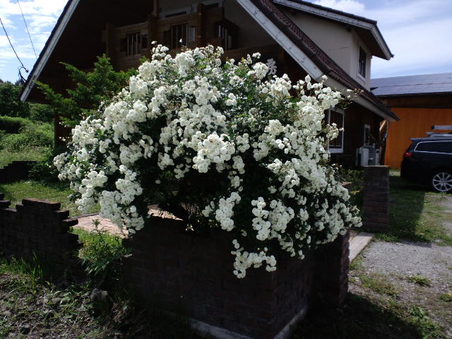 写真は当社の玄関口にあるバラです。今年も満開になりました。特に手入れはしていません。伸びてくると博山先生が、さっと丸刈りにしてしまいます。それでも毎年、綺麗な花を見せてくれる強者です。秋にも花を付けるんですよ!