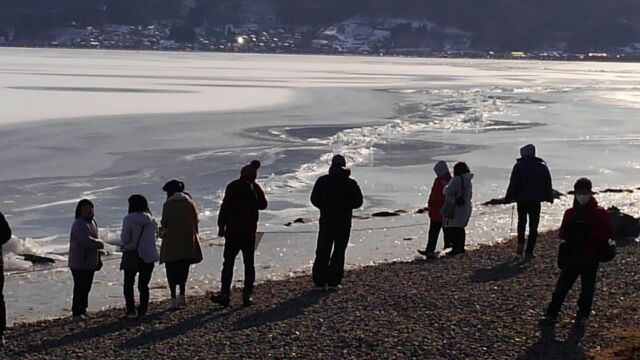 2018年2月14日 諏訪湖、御神渡り 諏訪湖、御神渡り(2018/2/8) 諏訪湖、赤砂崎の駐車場のすぐそばです。5年ぶりの御神渡りだそうです。平日でしたが、結構な人出でした。 今日は久しぶりに最高気温が5度ぐらいと暖かいお昼になりました。しかし、今年の寒さは厳しいですね。 水道管の凍結破損、漏水も結構出ています。お気をつけください。
