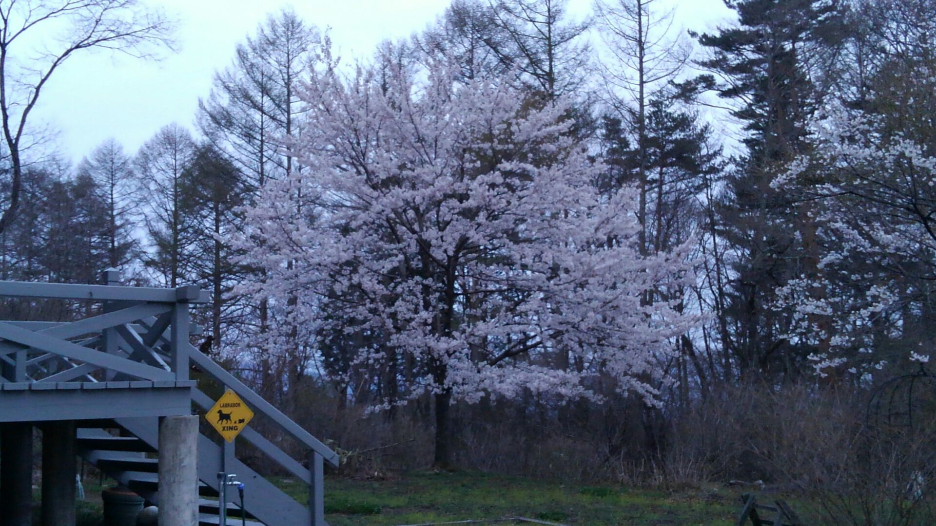 写真は小淵沢、標高1000M位です。周りの赤松が伐採されたヤマザクラは一本だけ残ったので、上部にだけ枝葉があるこんな樹形になっています。