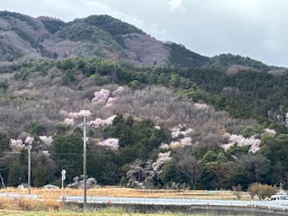 わに塚の桜から西側の山肌を見ると山桜が点々と美しい姿を見せてくれています。この山桜たちが山を登っていく様は本当に美しいです。