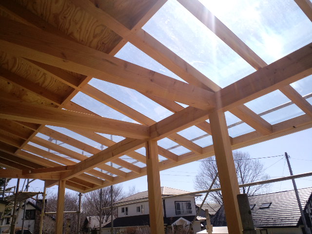 2011年4月4日 2011/04/04、構造検査 本日、完成後の瑕疵保証を行う会社の検査員による構造検査がありました。 結果は無事合格です。 写真は北東から見た全体像とウッドデッキ屋根のポリカーボネイトです。 屋根付きデッキで明かりも採れるようデザインしました。