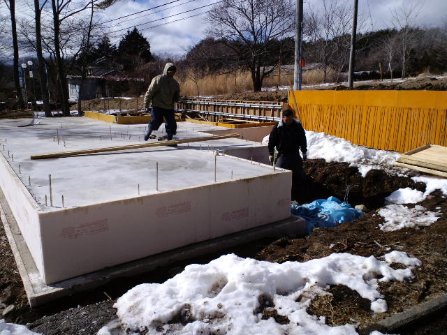 2011年2月18日 2011/02/18、基礎工事 悪天候をかいくぐって、無事、建物本体部分の耐圧板、基礎外周部のコンクリート打設を行いました。これから、駐車場、デッキ屋根部分の基礎工事に取りかかります。