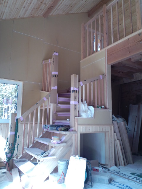 2011年2月7日 2011/02/05、大工造作工事 階段、手すりを大工さんの造作工事で進めています。 手すりは杉で、全て大工さんの手作りです。 1F駐車場から2Fへ上がる階段は、コンクリートが化粧になる作りで、デザイン的にもクールな感じで仕上がっています。