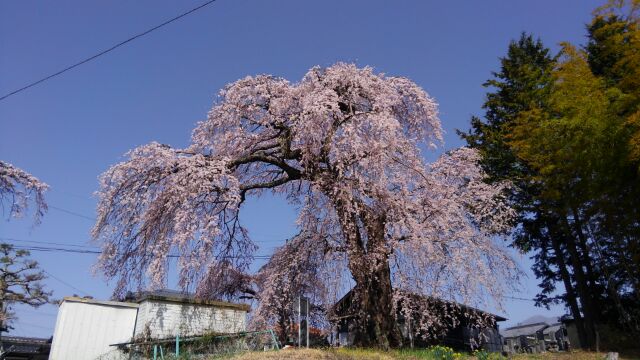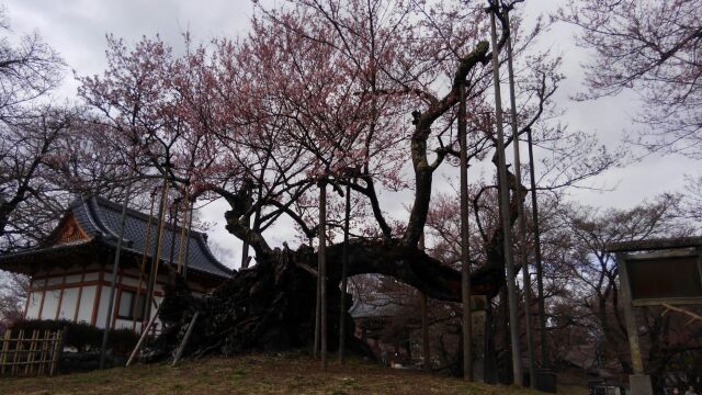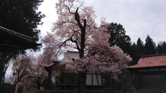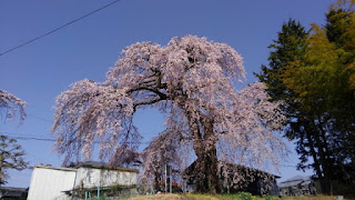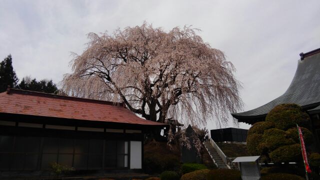 身延山の久遠寺から賜ったシダレザクラは大変大きく、境内の一番奥にドンと構えています。樹齢150年のエドヒガンザクラは一部折れたところもありますが、元気に花を咲かせていました。